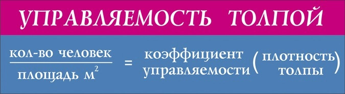 Итак, вернёмся к формированию толпы. Задача оппонентов: действовать таким образом, чтобы собрать большую массу людей на ограниченной территории. Соответствующие расчеты можно произвести, исходя из приведенной ниже формулы.
