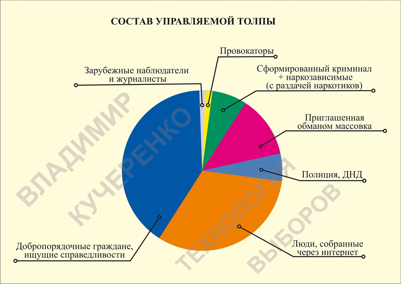 Ведь 100 организованных групп по 30 человек — это уже 3000 человек актива, который может быстро обрасти стихийно-присоединившимися людьми и заманенными на площадь наркоманами, преступниками, ЛГБТ-активистами, членами сект, представителями молодёжных субкультур, к которым в нужный момент незаметно примкнут специально обученные люди, понимающие, что такое управление толпой, а также провокаторы (достаточно 10−20 человек на 1000 человек).