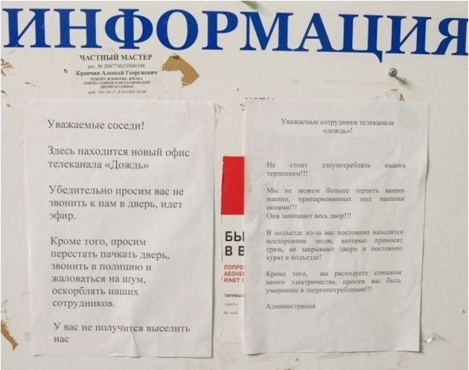«Дождь» теперь вещает из жилого дома. Соседи такому «подарку» под Новый год совсем не рады и уже активно переписываются с журналистами через доску объявлений.
