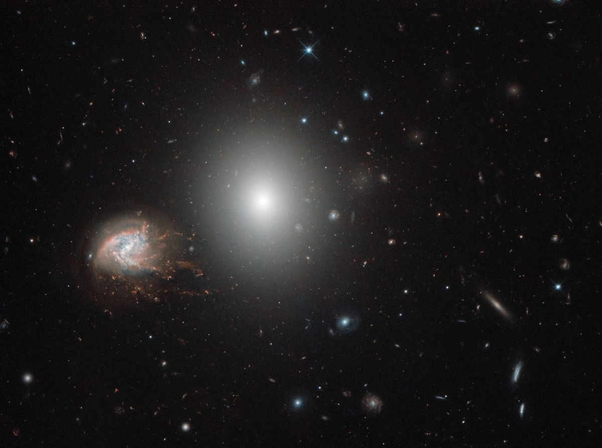 Галактика NGC 4858 окружена светящимися скоплениями вещества, которые, как видно на снимке, выходят из галактики. На снимке NGC 4858 находится слева от яркой NGC 4860.