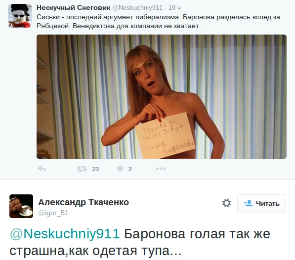 Как и следовало ожидать, вразумительных речей от координатора проекта Ходорковского сетевая публика не увидела. Большинство обитателей блогосферы, ознакомившись с ее умозаключениями, сочли более достойным поводом для обсуждения само фото Бароновой:
