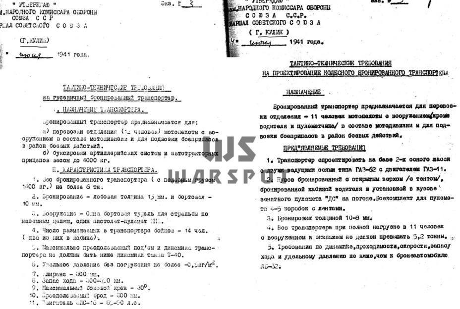 Тактико-технические требования на те самые бронетранспортёры, которые не дают покоя любителям альтернативной истории. Из-за начала Великой Отечественной войны идею по понятным причинам положили под сукно