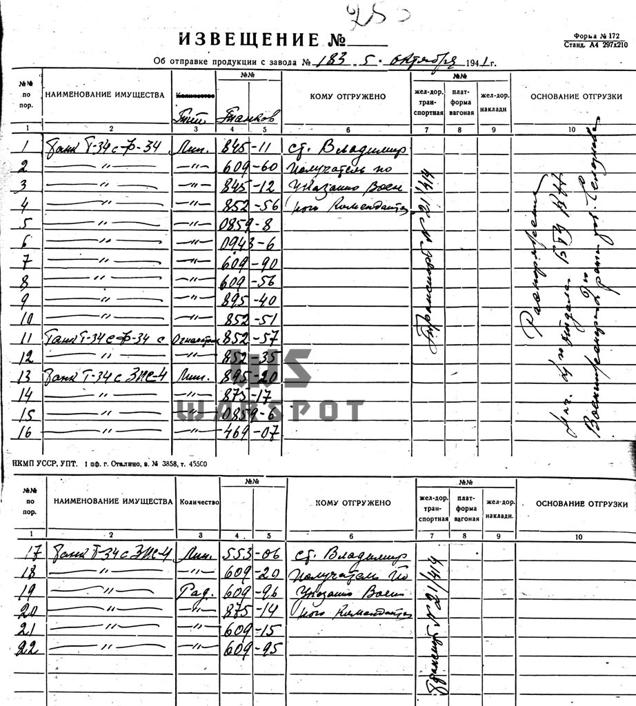 Здесь выясняются дополнительные подробности относительно ЗИС-4. Именно для использования с этой системой был разработан телескопический прицел ТМФД-7, а на обычных Т-34 ставился телескопический прицел ТОД-6. Опять же, переписка по этому вопросу идёт только с заводом №183. В начале августа 1941 года шла активная переписка между заводом №183 и ГАБТУ КА, в Харькове ждали новые пушки, поскольку сверху им уже спустили план по выпуску танков, оснащённых 57-мм пушками. Наконец, 24 августа в Харьков отправились 10 пушек ЗИС-4, а также 20 комплектов прицелов.
