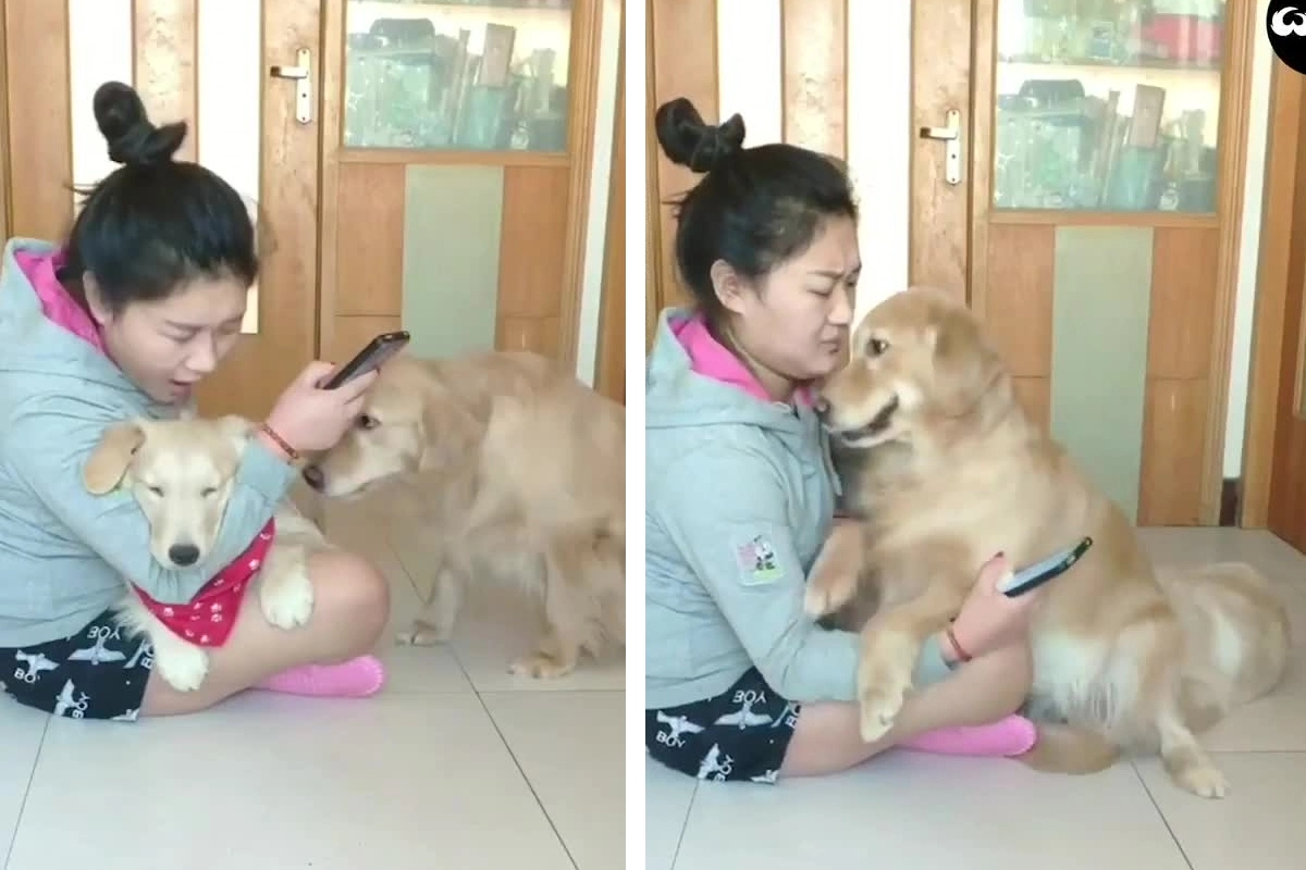Представьте себе такую ситуацию: вы очень сильно скучаете по человеку и ждете его с работы, а он приходит и вместо вас начинает обнимать кого-то другого. Представили? Теперь вы приблизительно понимаете эмоции героя этого вирусного ролика, которому надоело ждать своей очереди на обнимашки с хозяйкой. Ревнивый ретривер просто оттащил своего брата и занял его место.