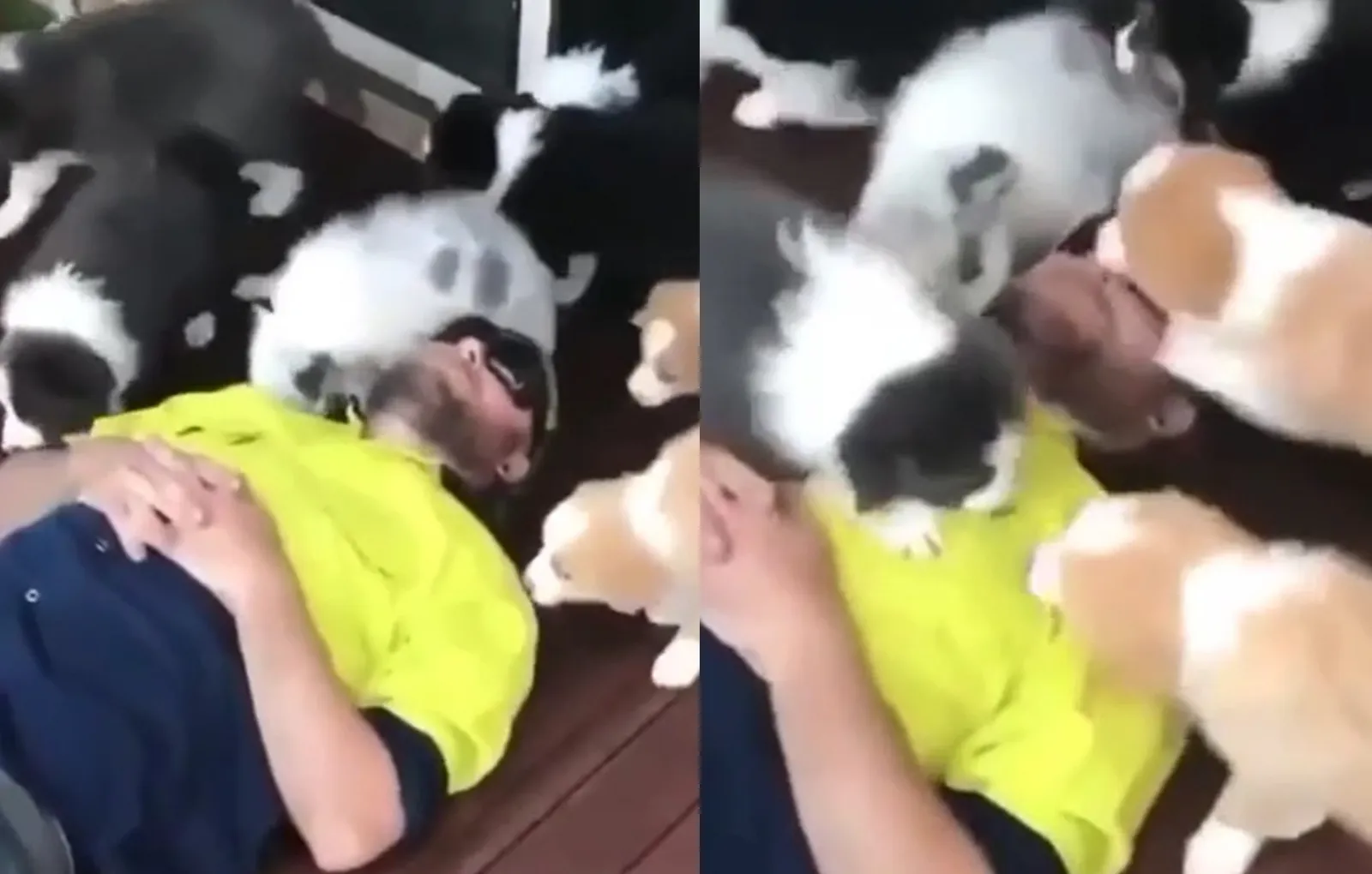 Любопытные и дружелюбные малыши быстро выбежали из дома и стали облизывать человека так активно, будто это действительно могло исцелить все его душевные и физические раны. Все это время мужчина просто лежал и улыбался. Кажется, спа-процедура с крошечными пёсиками прошла отлично.