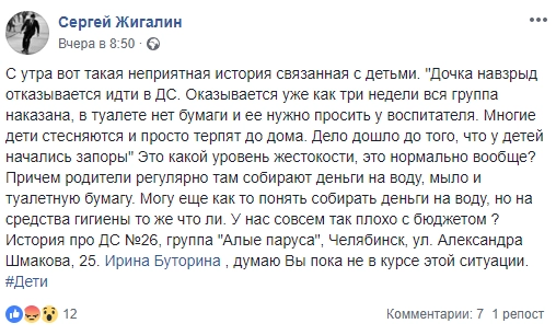 Родители воспитанников одного из детских садов Челябинска пожаловались на отсутствие туалетной бумаги в группах. По их словам, дети вынуждены терпеть нужду и ходить в туалет только придя домой.