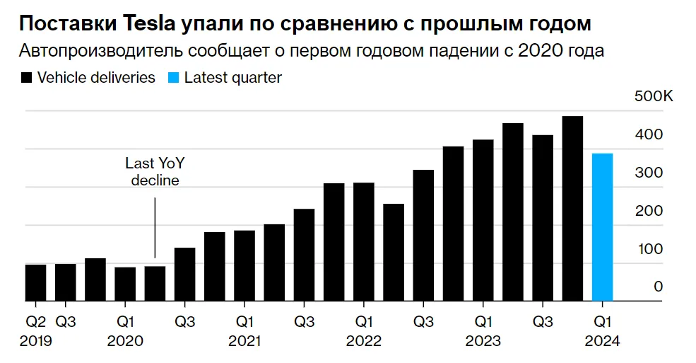 Согласно официальному сообщению компании, за первые три месяца 2024 года Tesla продала 386 810 автомобилей, что на 20,2% меньше, чем в предыдущем квартале.