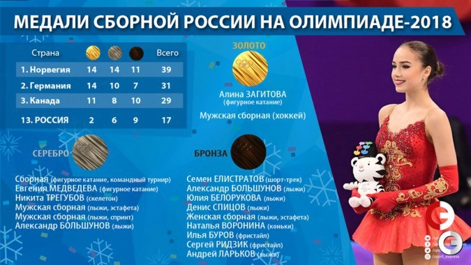 Зимние Олимпийские игры 2018 года проходили в корейском городе Пхёнчхане с 6 по 25 февраля. Спортсмены нашей страны завоевали 17 медалей, из них 2 золотые, 6 серебряных и 9 бронзовых. Выступая без флага, гимна, российской символики, а зачастую даже без тренеров и помощников, наши атлеты проявили невероятную силу воли и характер и выступили достойно.