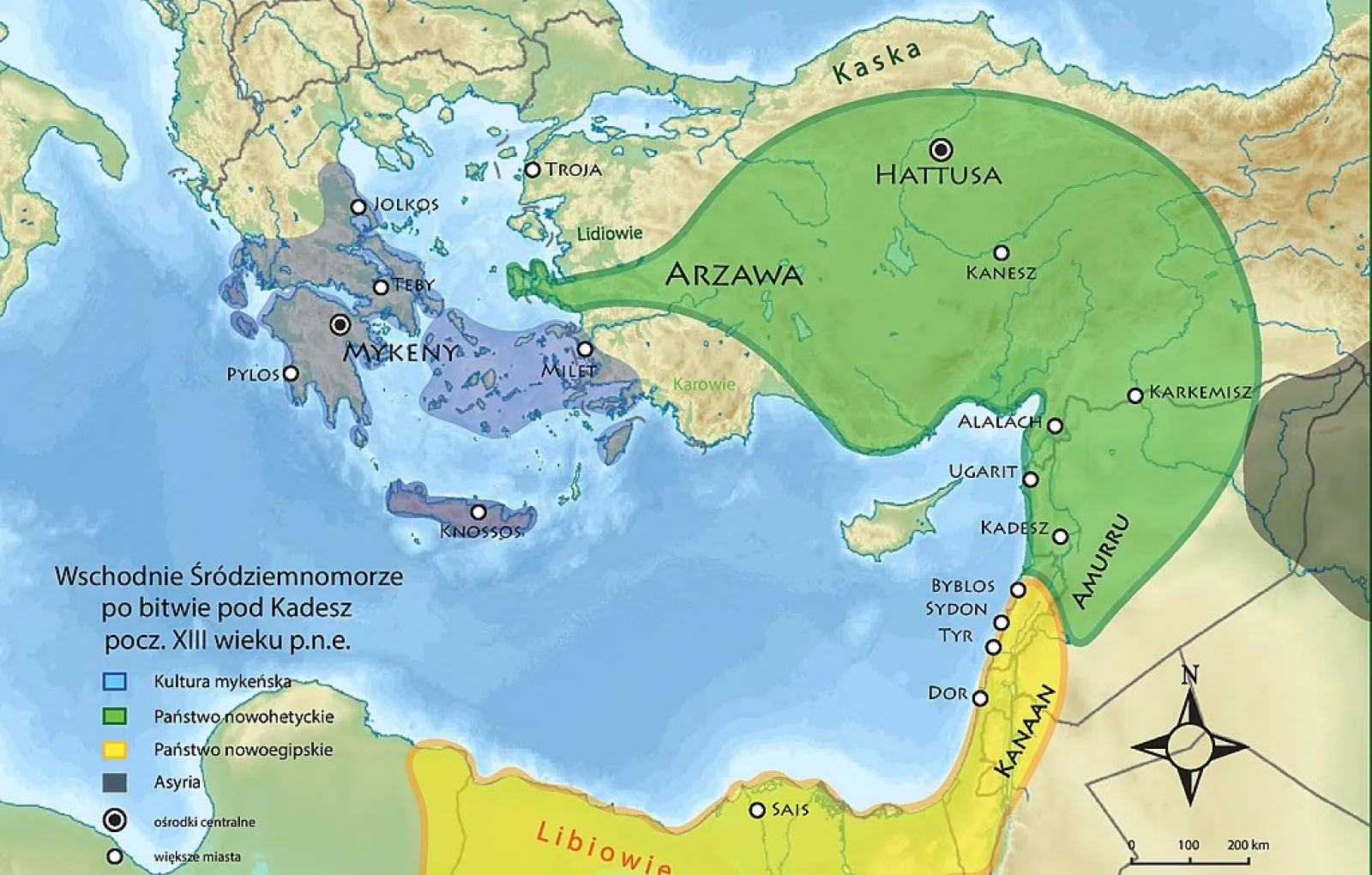 Египет (выделен жёлтым) и Хеттское царство (зелёный) во время борьбы за гегемонию в Восточном Средиземноморье, рубеж XIV и XIII веков до н. э.