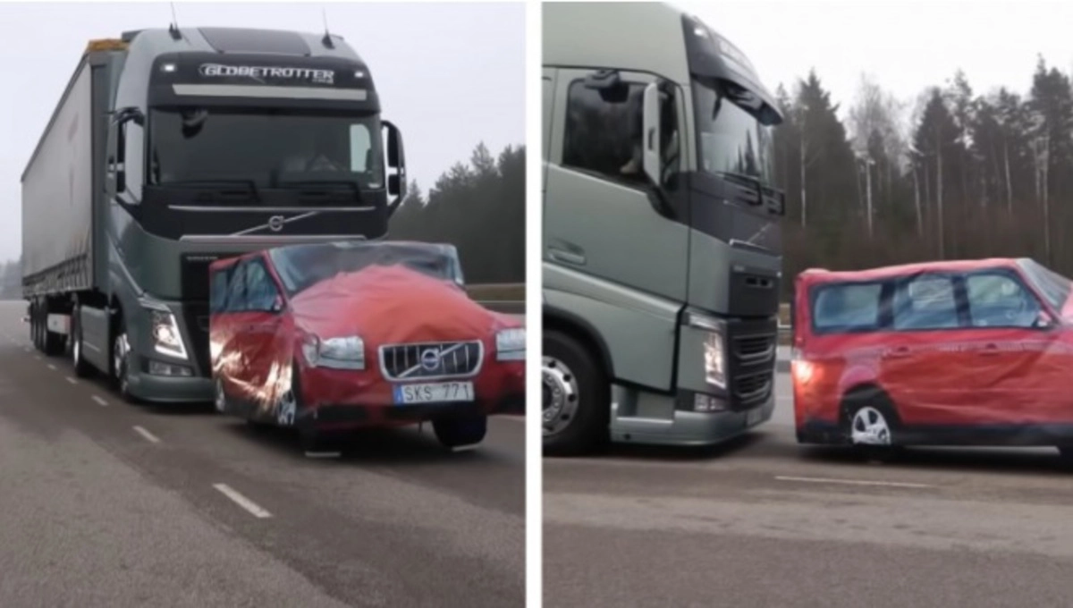 В социальных сетях обсуждают видеоролик, демонстрирующий работу систем предупреждения о столкновении и экстренного торможения грузовых автомобилей Volvo. Технология показана на примере седельного тягача с прицепом и 40 тоннами груза, движущегося на высокой скорости. Грузовик сбрасывает высокую скорость и останавливается на минимальной дистанции от препятствия.