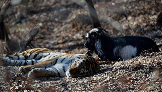 Об этом сообщается на сайте Приморского сафари-парка. Ночь с 18 на 19 января козел провел на плотной подстилке из соломы рядом с тигром.