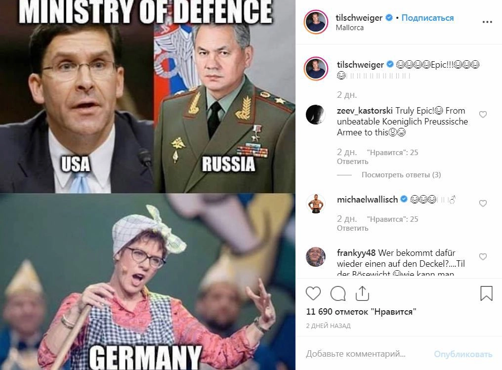 Ироничный коллаж Швайгер опубликовал в своем фотоблоге. Шойгу и Эспер на нем выглядят нормально, а Аннегрет Крамп-Карренбауэр изображена в виде поющей домохозяйки со шваброй в руках. «Эпично!», — подписал коллаж Швайгер.