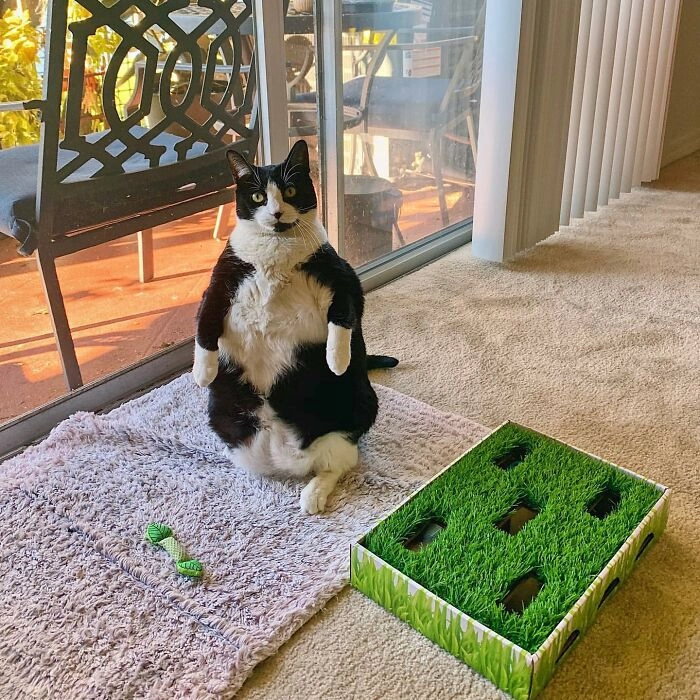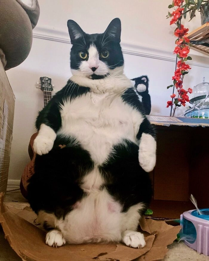 Зачем вы так закормили кошку? Она сидит так из-за лишнего веса!