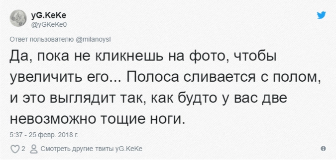 Однако если приблизить фотографию и присмотреться повнимательнее, то выяснится, что светлая линия — это не промежуток между ногами, а полоска на брюках. Снимок быстро стал вирусным и, собрав почти 40 тысяч лайков и 6,5 тысяч репостов, привлёк к себе внимание тысяч пользователей по всему миру.