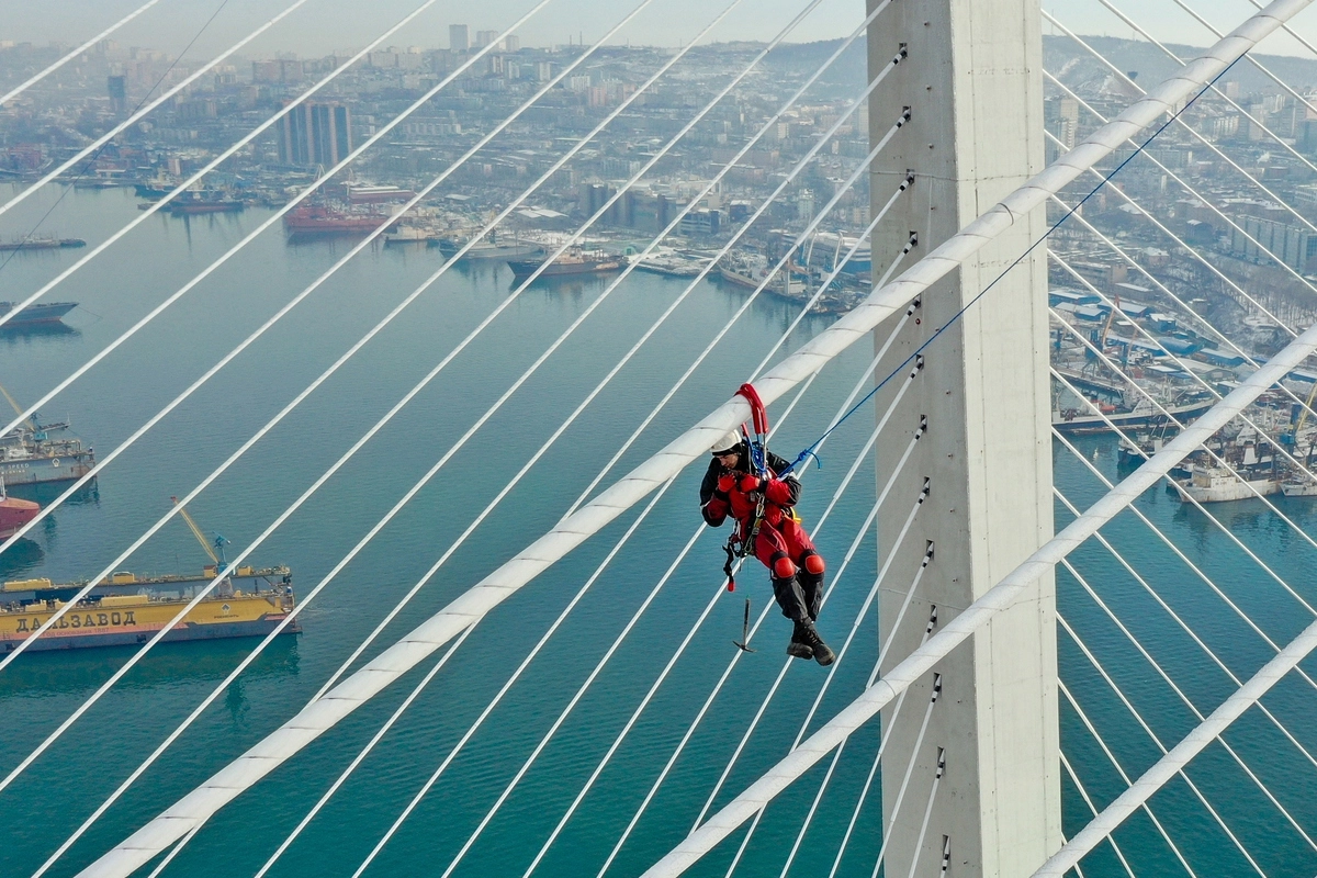 Очистка вант Золотого моста от наледи во Владивостоке.