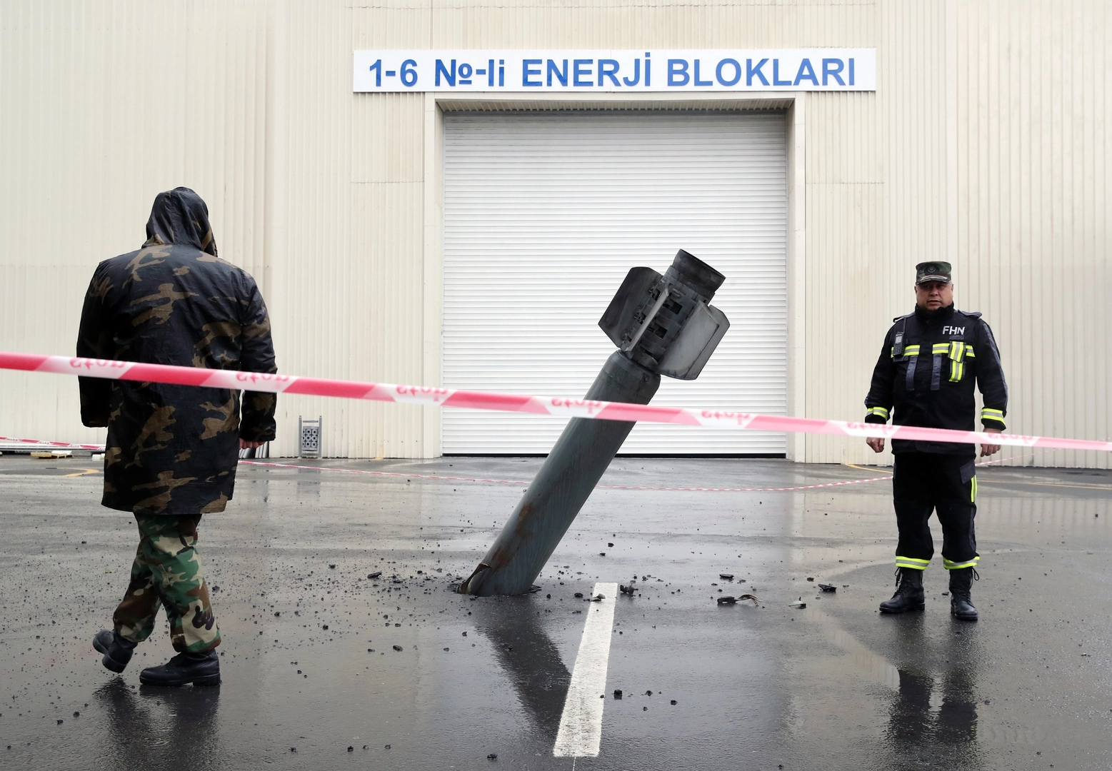 Нагорный Карабах. Хвостовой элемент снаряда реактивной системы залпового огня (РСЗО) «Смерч» у энергоблока Мингечевирской ГЭС.