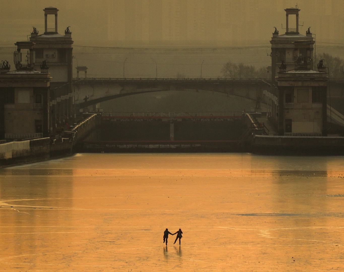 Декабрь. Горожане катаются на коньках по льду канала имени Москвы.