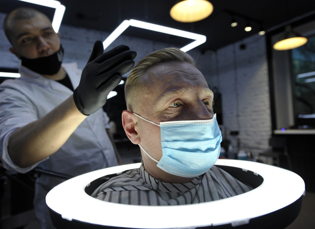Мурманск во время ослабления режима самоизоляции. Стрижка посетителя в барбершопе Mafiozi.© Лев Федосеев/ТАСС