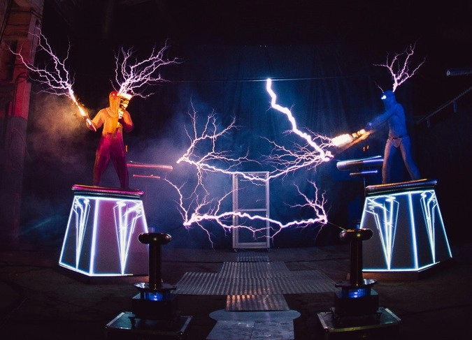 Лазерное шоу и настоящая электронная музыка в исполнении молний добавляют настроения сверхсовременного действия, способного впечатлить как детей, так и взрослых. Помимо самого новогоднего шоу, зрителей ждут 15 трансформаторов Тесла различных размеров и мощности, настоящие молнии длиной от 2 до 7 м, аттракцион «Клетка страха», а также Плазма-шоу и Неон-шоу.