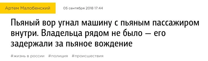 Пьяный вор угнал машину с пьяным пассажиром внутри. Владельца рядом не было — его задержали за пьяное вождение