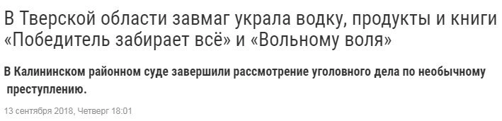 В Тверской области завмаг украла водку, продукты и книги «Победитель забирает всё» и «Вольному воля»
