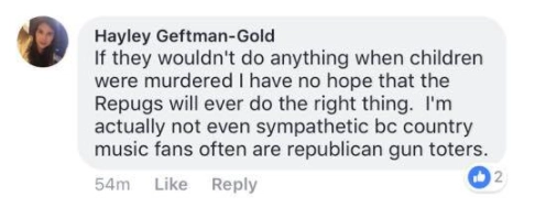 «Если они ничего не сделали, когда детей убивали, у меня нет надежды, что республиканцы когда-нибудь сделают что-то правильное. Я не сочувствую фанатам кантри-музыки, потому что большинство из них — республиканцы со стволами», — написала она.
