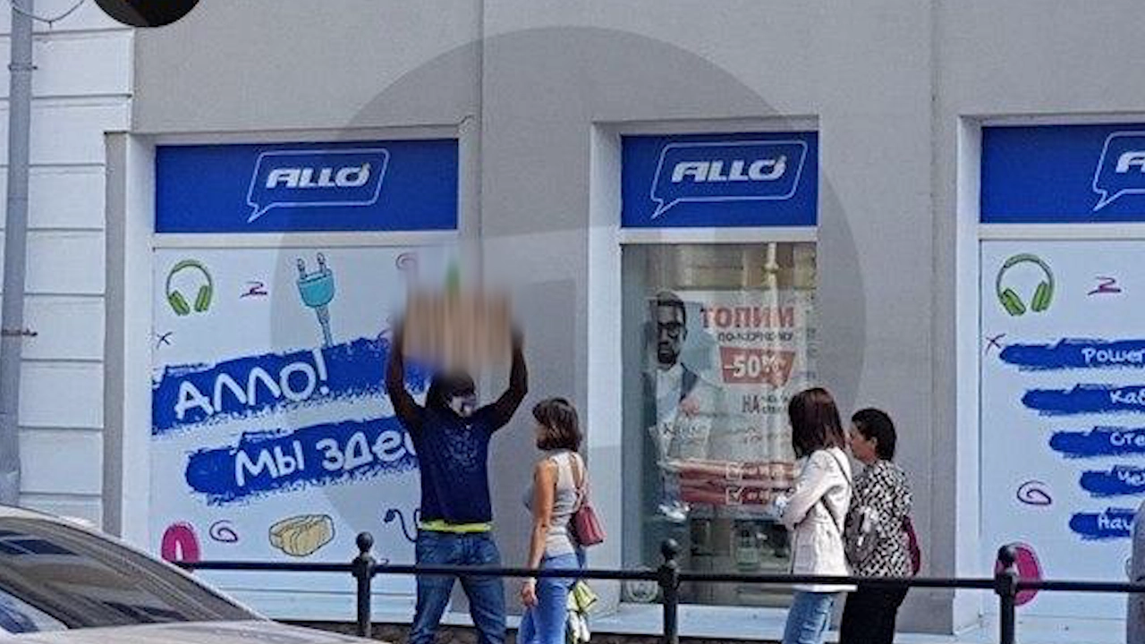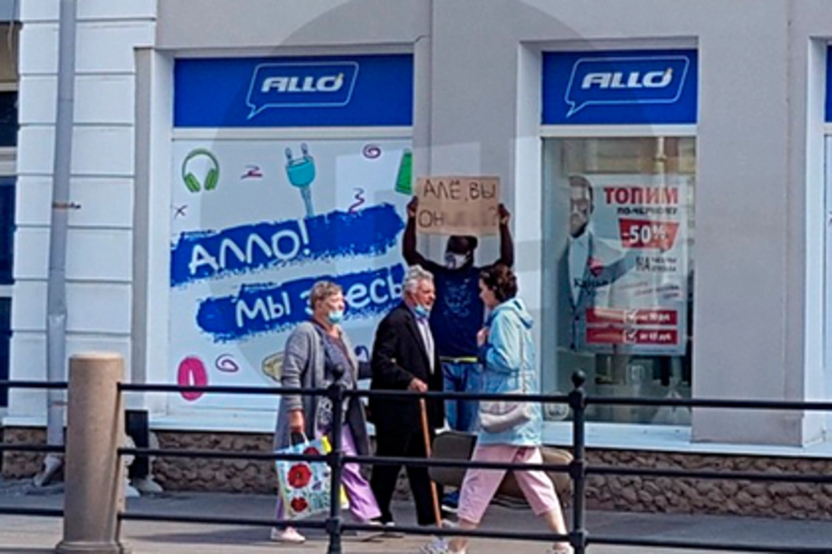 На витрине магазина электроники Allo появилась вывеска, где был изображен мужчина с темным цветом кожи и лозунгом «Топим по-черному». На кадрах видно, как напротив магазина стоит темнокожий парень и держит плакат.