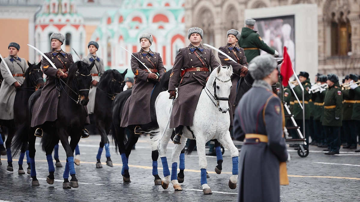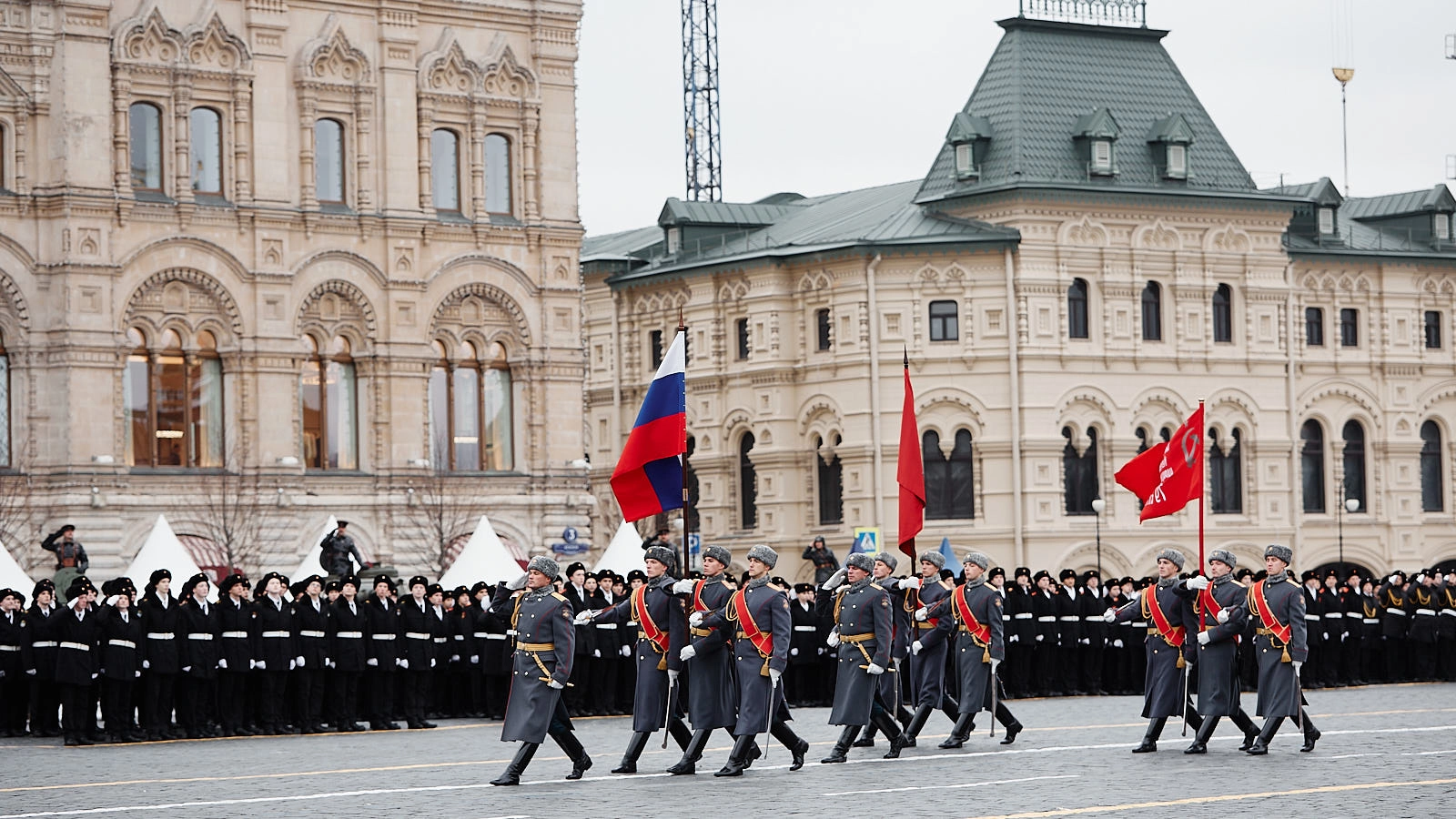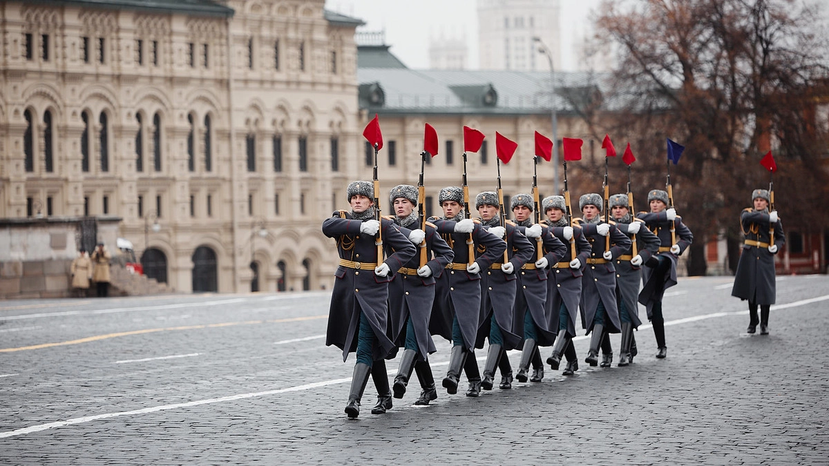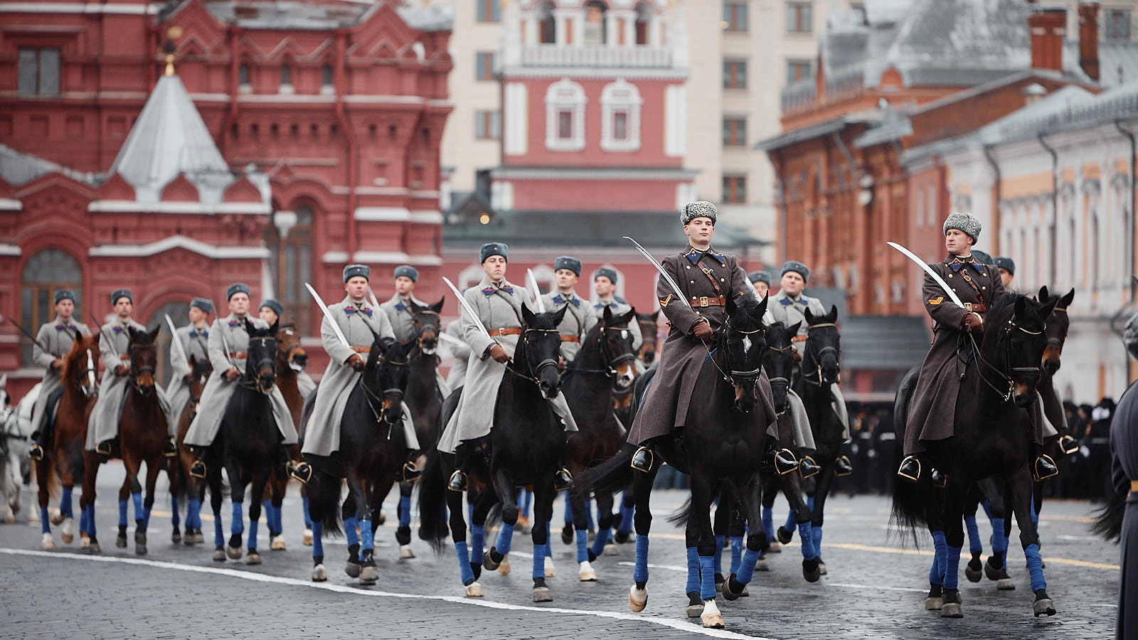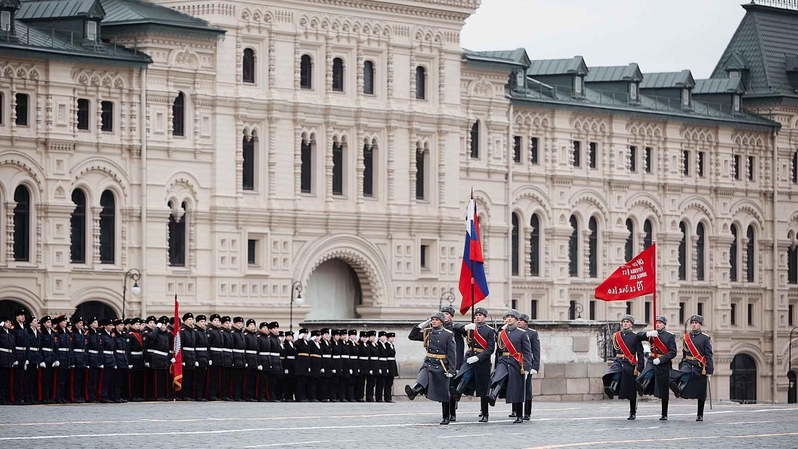 Под аккомпанемент сводного военного оркестра московского гарнизона по Красной площади прошли четыре тысячи человек, включая почетный караул ВС РФ, кавалерийскую группу всадников президентского полка, суворовцев, кадетов и военнослужащих Минобороны России.