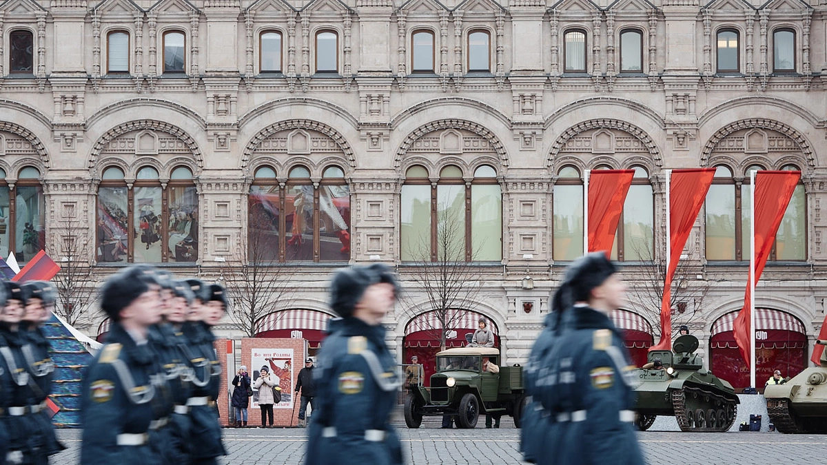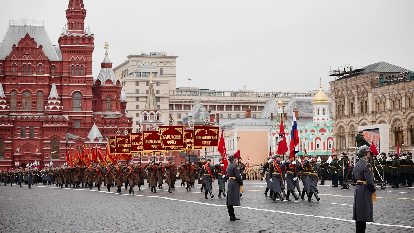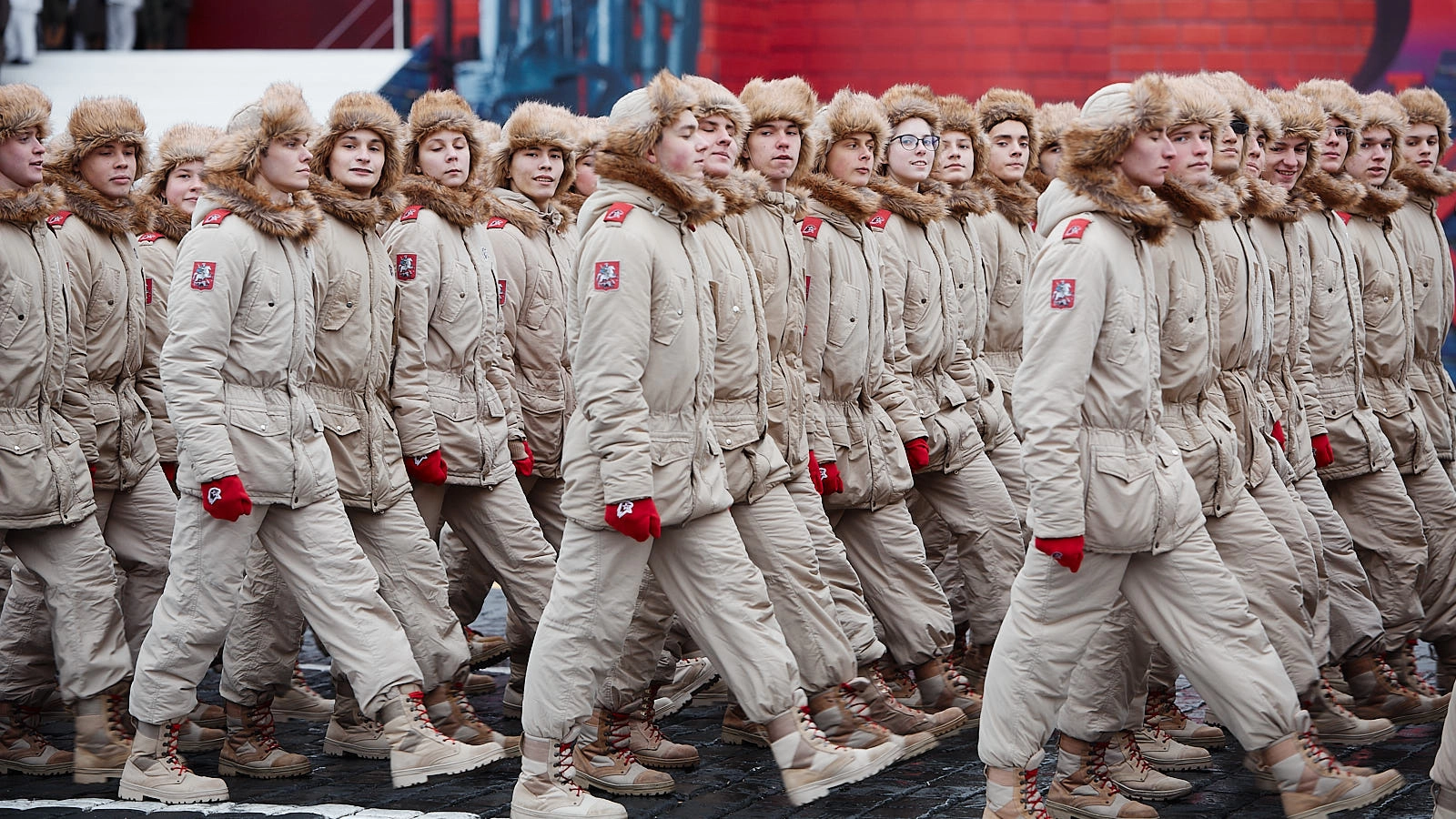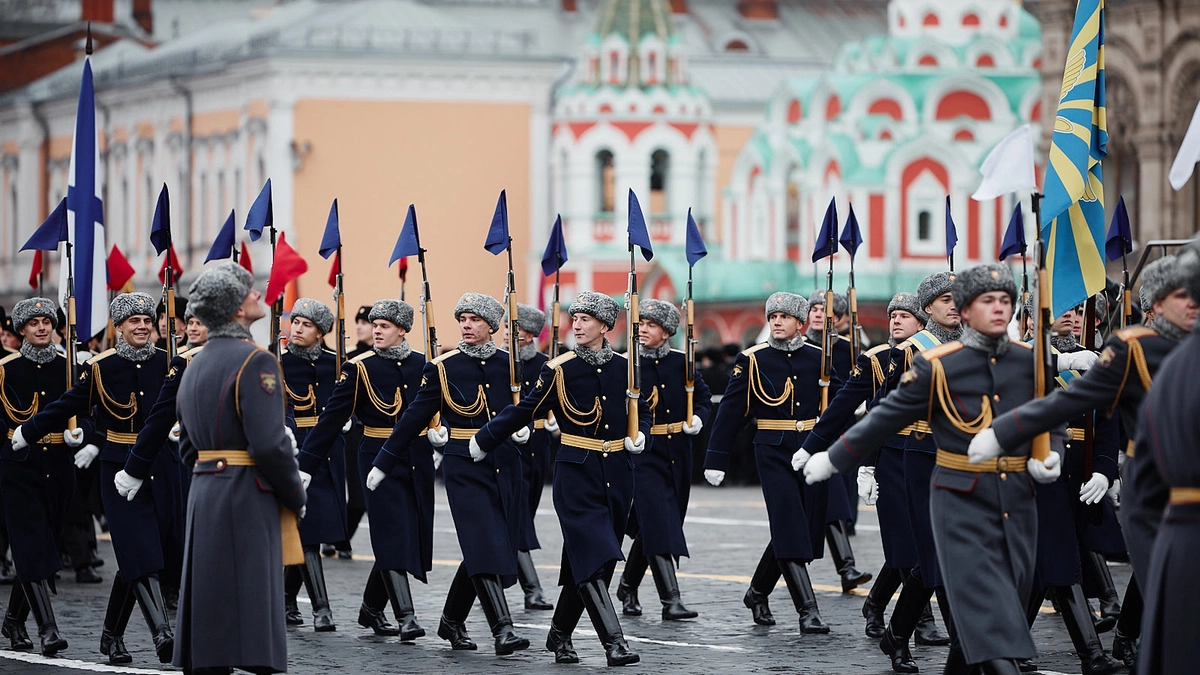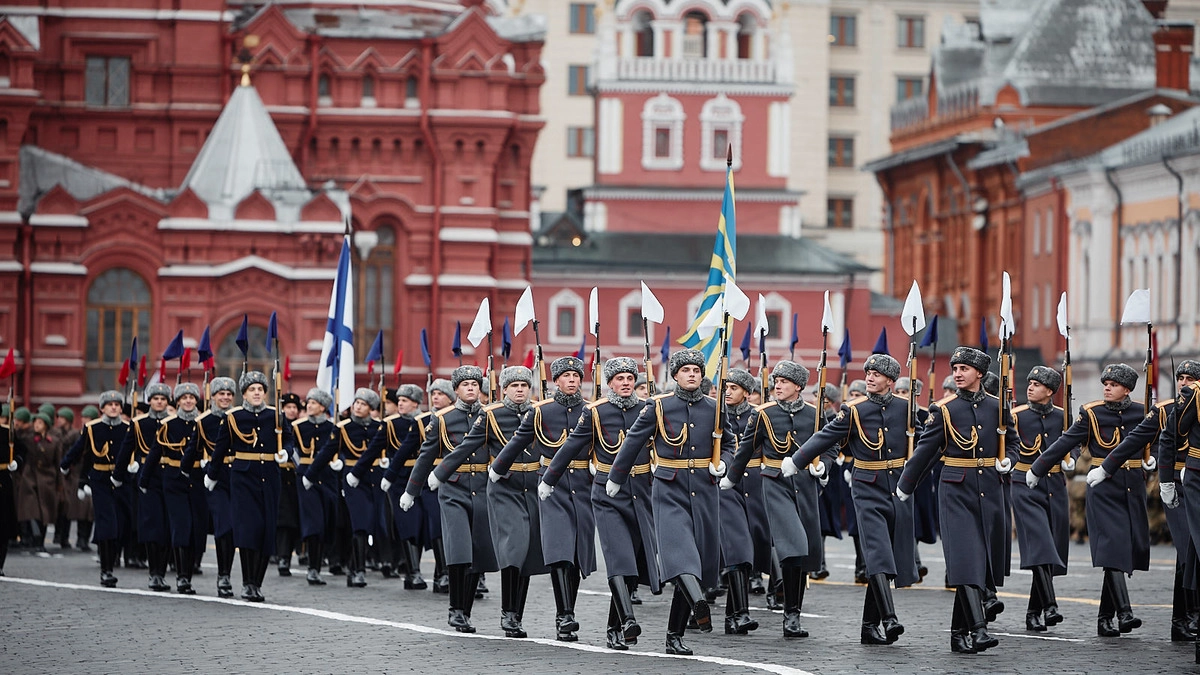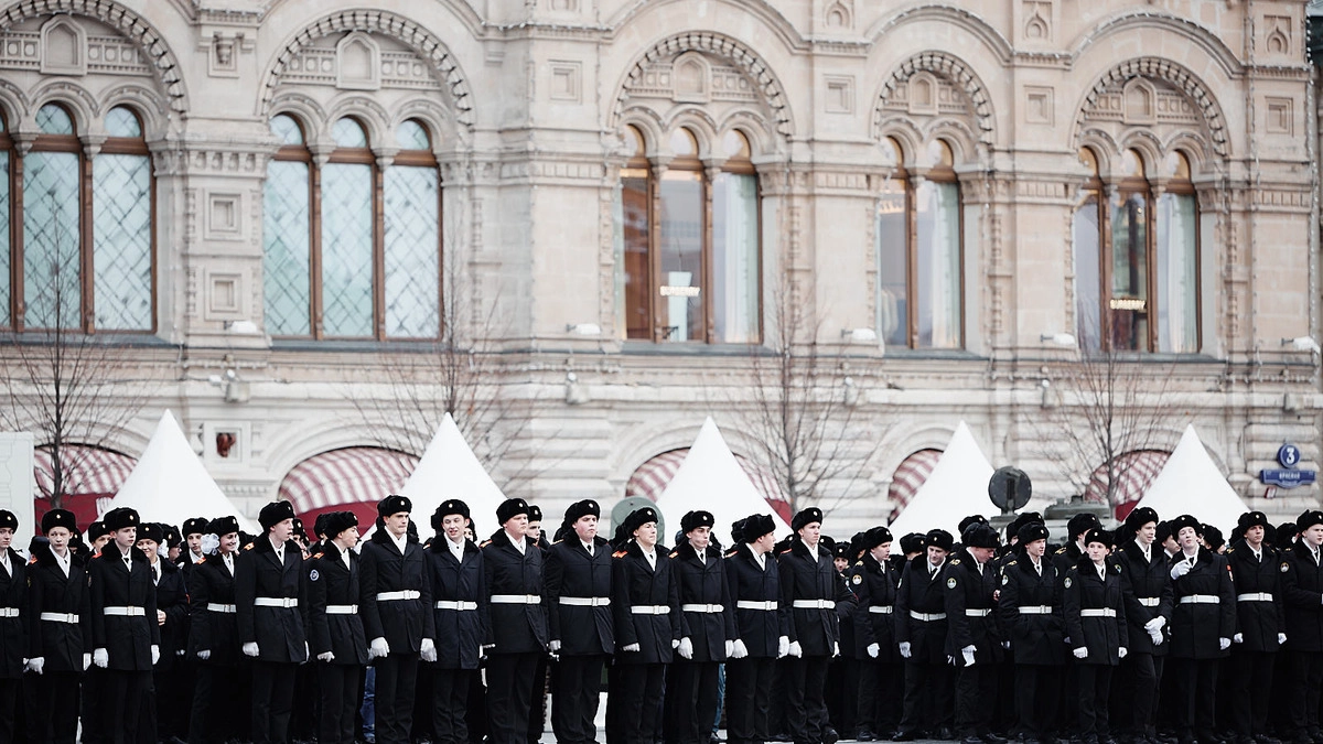 Под аккомпанемент сводного военного оркестра московского гарнизона по Красной площади прошли четыре тысячи человек, включая почетный караул ВС РФ, кавалерийскую группу всадников президентского полка, суворовцев, кадетов и военнослужащих Минобороны России.