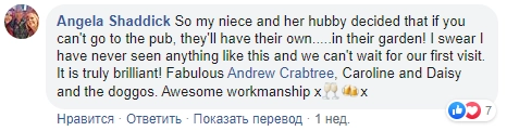 «Моя племянница и ее муженек решили, что если они не могут посещать паб, то надо построить в саду свой собственный. Клянусь, что никогда не видела ничего подобного и жду — не дождусь, когда мы сможем прийти в гости. Это просто замечательно!"