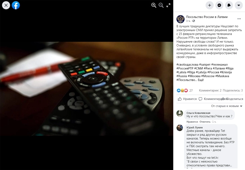 «В лучших традициях диктатуры Нацсовет по электронным СМИ принял решение запретить с 15 февраля ретрансляцию телеканала „Россия РТР“ на территории Латвии. Нарушение свободы слова? И не только. Очевидно, в условиях свободного рынка латвийские телеканалы не могут выдержать конкуренции, даже в информпространстве своей страны», — сказано в сообщении российского посольства.