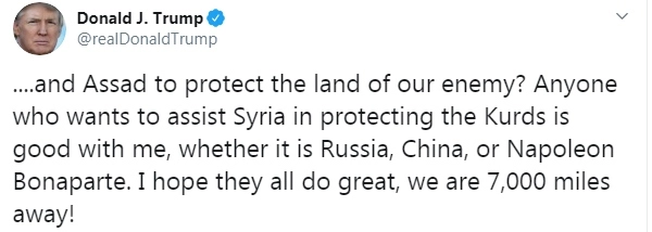 Президент США Дональд Трамп готов благословить любого, кто встанет на защиту курдов. Будь это Россия, Китай или Наполеон Бонапарт. Об этом американский лидер написал в Twitter.