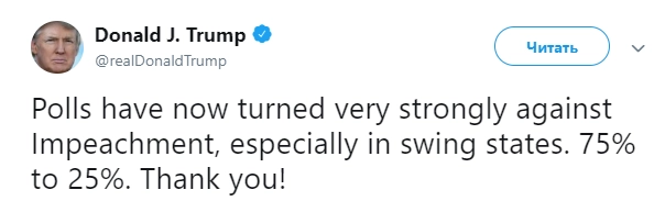 «Опросы красноречиво подтверждают настрой против импичмента. Сильнее всего он проявляется в колеблющихся штатах. 75% против 25%», — написал глава государства в Twitter.