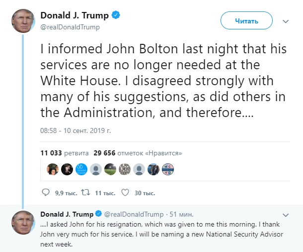 Президент поблагодарил Болтона за службу и отметил, что новый советник президента США по национальной безопасности будет назван на следующей неделе.