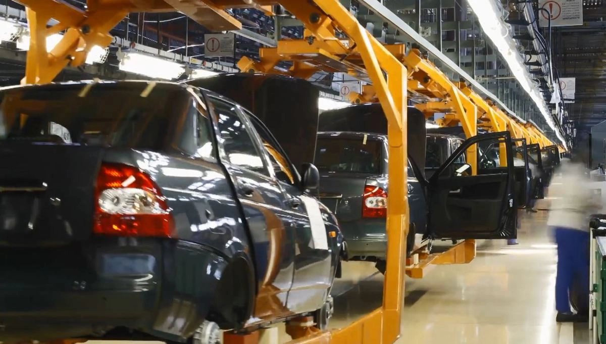 Конвейер с почти собранными автомобилями LADA Priora на одну секунду появляется на 2:59, при этом в правом верхнем углу отчетлива видна табличка с надписью на русском языке о правилах техники безопасности.