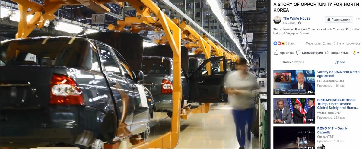 На официальной странице Белого дома в социальной сети Facebook опубликован видеоролик, который был специально снят для переговоров президента США Дональда Трампа с лидером Северной Кореи Ким Чен Ыном 12 июня в Сингапуре. Непонятным пока образом в это видео затесались кадры со сборочной линии АвтоВАЗа.