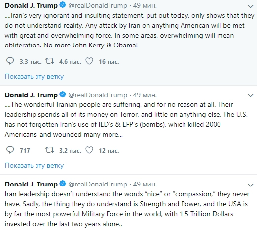 «Любая атака Ирана на что-либо американское будет встречена с огромной и подавляющей силой», — написал Трамп в своем микроблоге в Twitter, добавив, что «в некоторых областях подавление будет означать уничтожение».