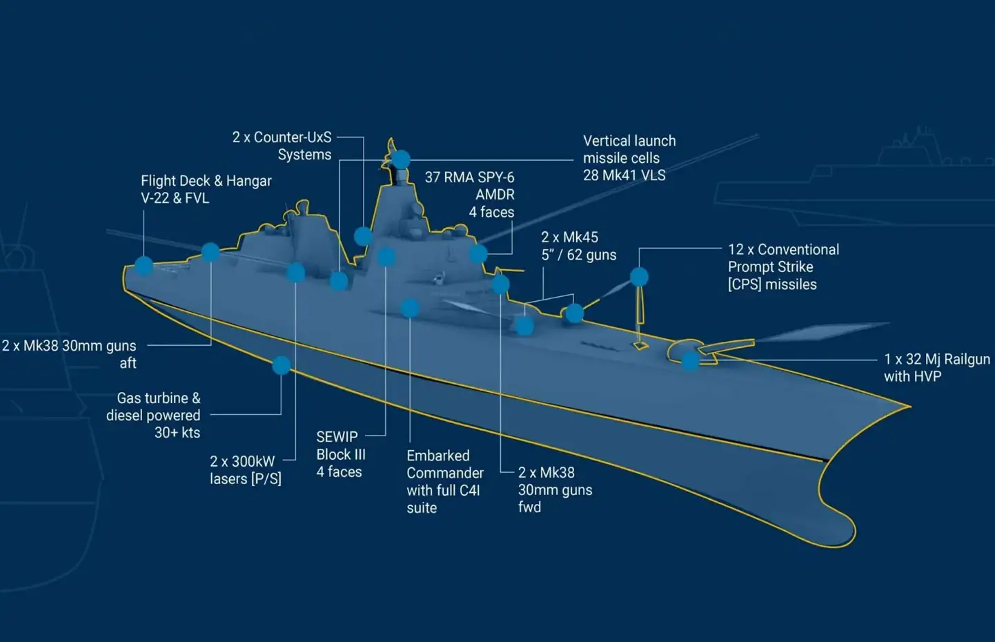 Благодаря модульной конструкции корабли такого класса смогут в течение всего срока службы оснащаться новыми технологиями, включая узлы управления беспилотными аппаратами, системы наведения с использованием искусственного интеллекта, комплексы кибервойны и электромагнитное оружие следующего поколения.