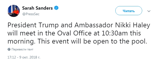 Пресс-секретарь Белого дома Сара Сандерс анонсировала в Twitter предстоящую встречу Трампа и Хейли, которая должна состояться в Овальном кабинете в 10:30 по местному времени.
