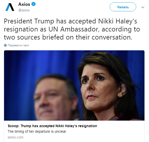 Президент США Дональд Трамп принял отставку постоянного представителя США при ООН Никки Хейли, сообщает Axios со ссылкой на два неназванных источника.