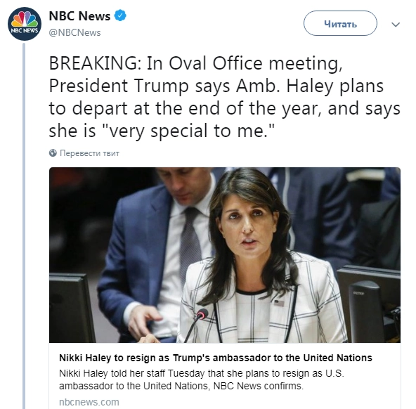 Позже Трамп заявил, что Хейли предупредила его об отставке за шесть месяцев и покинет свой пост в конце года, сообщает NBC.