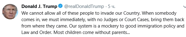 «Когда кто-то пытается проникнуть к нам, мы должны немедленно, без судебных решений, высылать их туда, откуда они пришли. Наша система является издевательством над иммиграционной политикой и правопорядком», — заявил президент, добавив: «Большинство детей приходит без родителей…»