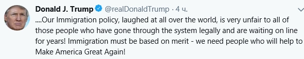 «Иммиграция должна основываться на заслугах — нам нужны люди, которые помогут снова сделать Америку!» — резюмировал президент США.