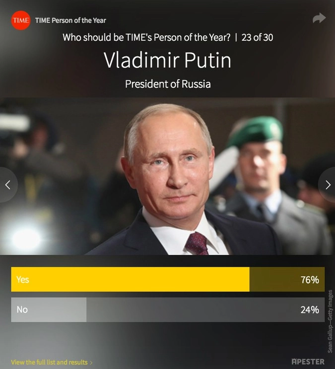 Тем временем на сайте издания продолжается пользовательское голосование, согласно которому лидируют президент России Владимир Путин основатель Wikileaks Джулиан Ассанж и избранный президент США Дональд Трамп.