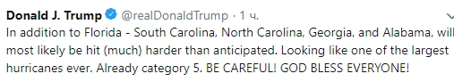 В дополнение к Флориде — Южная Каролина, Северная Каролина, Джорджия и Алабама, скорее всего, пострадают (намного) сильнее, чем ожидалось, — написал американский лидер в своем микроблоге в Twitter.
