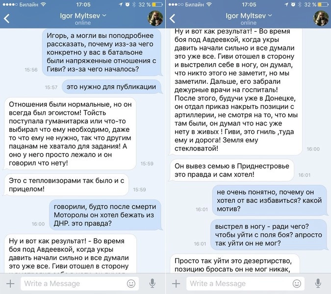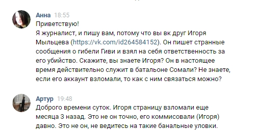 «Страничка была взломана в сентябре 2016, с 3 марта я по состоянию здоровья был уволен из рядов армии ДНР и с „Гиви“ не пересекался никогда…» — сообщил он корреспонденту «Ридуса».