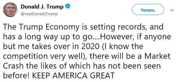 «Экономика Трампа устанавливает рекорды, и ей еще предстоит пройти долгий путь», — написал американский лидер на своей странице в Twitter.