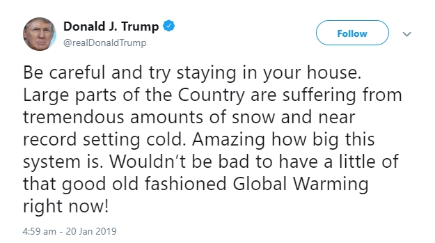 Президент США Дональд Трамп обратился к нации в связи с аномальными снегопадами и похолоданием, накрывшими значительную часть территории страны. В своей записи, призывающей американцев по возможности не выходить из дома, известный противник теории глобального потепления Трамп не смог обойти стороной этой излюбленной темы.