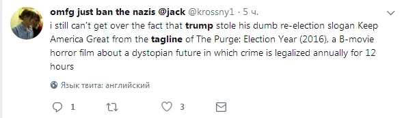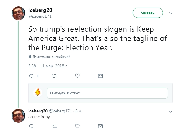 «Итак, слоган новой избирательной кампании Трампа — «Сохраним Америку великой». Это слоган «Судной ночи-3»… Какая ирония».