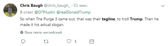 «Я до сих пор не могу поверить, что Трамп украл слоган будущей избирательной кампании из фильма «Судная ночь-3» — триллера о мрачном будущем, где преступность ежегодно легализуют на 12 часов», — написал один из блогеров.
